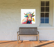 "LuLu" features a colorful whimsical cow with eyeglasses perched on her forehead and a sunflower in her mouth.