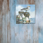 "Seagull Pier" features a seagull perched on a pier post adorned with colorful buoys.