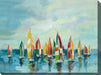 "Bright Sails" features an abstract oil painting of colorful sail boats on still water.