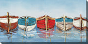 "All in a Row" features an oil painting of five colorful rowboats moored in a row.
