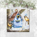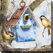 "Winter Home" features artistic birds perched in front of a stylish birdhouse nestled in a tree with snow falling.