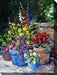 "Blue Pots" features colorful flowers in clay pots in front of a brick fence.