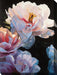 "Blushing Beauty" features an oil painting of lighted pink peony blooms against a black background.