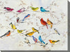 "Meet & Greet" features an oil painting of colorful birds gathered on tree branches.
