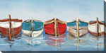 "All in a Row" features an oil painting of five colorful rowboats moored in a row.