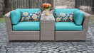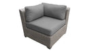 This 3-piece set of outdoor wicker furniture consists of 2 corner pieces with cushions and a cup holder table making a divided loveseat. Subtle grey and natural hues along with your choice of cushion covers makes a contemporary and sophisticated statement for guest seating or the perfect setup for two.