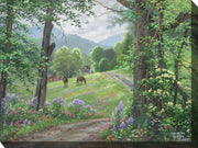 "The Ridge" features an oil painting landscape of horses grazing on the side of a hill with a farmhouse in the background.