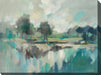 "Blue Day" features an oil painting abstract of a tree lined pond landscape with teal tones.