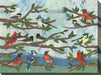 "Mixed Company" features a variety of colorful birds sitting on branches seemingly engaged in conversation.