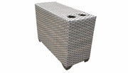 This 3-piece set of outdoor wicker furniture consists of 2 corner pieces with cushions and a cup holder table making a divided loveseat. Subtle grey and natural hues along with your choice of cushion covers makes a contemporary and sophisticated statement for guest seating or the perfect setup for two.