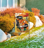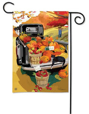 This whimsical harvest garden flag designed by Martha Collins will bring a smile to your visitors. The design depicts a black pickup truck filled with pumpkins and apples guarded by the family dog and cat.